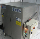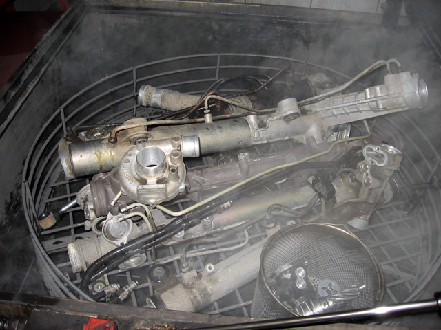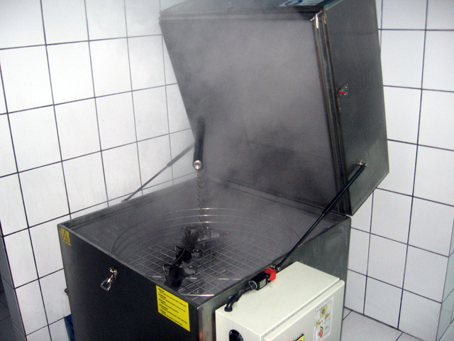Myjnia parowo-koszowa to niemal najważniejsze urządzenie w naszej firmie. Detergenty w połączeniu z wysoką temperaturą, usuwają wszelkie naloty olejowe, piach, wodę i inne zanieczyszczenia dostające się do środka przekładni kierowniczej. Medium myjące jest wzbogacone o inhibitory korozji, które po myciu mają chronić przed wilgotnym powietrzem atmosferycznym, które może tworzyć mikro korozję. Warto zaznaczyć, iż jest to mycie zgrubne. Proces mycia wstępego trwa od 30 do 120 minut. Wstępnie umyte elementy hydrauliczne, są ponownie myte w myjce ultradźwiękowej.